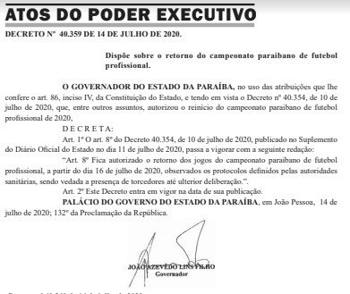 Governador da Paraíba autoriza retorno do Campeonato Paraibano de Futebol