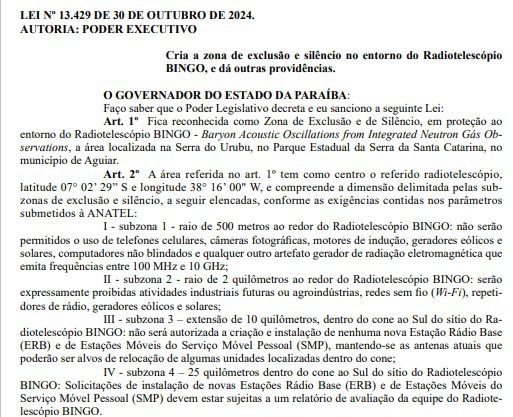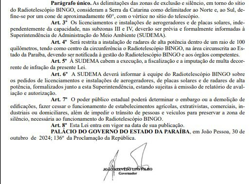 O governador João Azevêdo (PSB) criou a zona de exclusão e silêncio na área do entorno do radiotelescópio BINGO, que fica no município de Aguiar, no Sertão paraibano. A medida foi publicada na edição desta quinta-feira (31) do Diário Oficial do Estado (DOE).