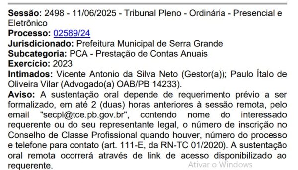 O TCE-PB (Tribunal de Contas do Estado da Paraíba) intimou o prefeito de Serra Grande, Vicente Antonio da Silva Neto, para explicar o aumento de mais de 46% no gasto com festividades, enquanto não estava pagando o piso dos professores da rede municipal de ensino.