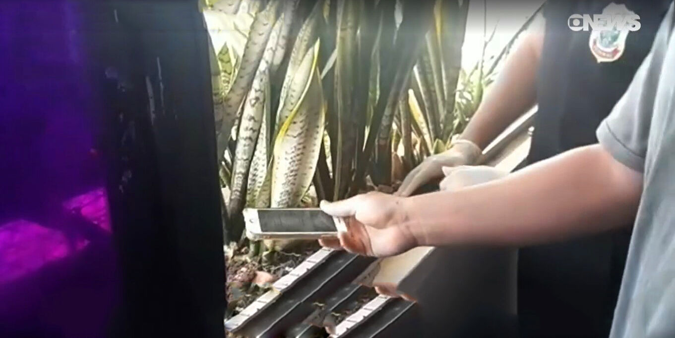 Foi aí que um agente encontrou um aparelho celular parcialmente enterrado em meio às plantas que ficavam em uma jardineira nessa janela. Sérgio Gama insistiu que não iria negar entregar o aparelho, apenas tinha deixado ele ali antes de abrir a porta, e voltou a dizer que estava rezando.