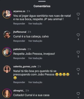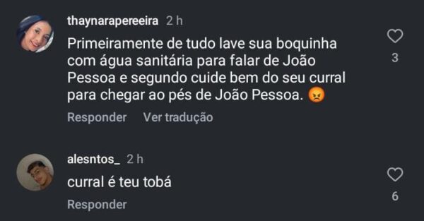 Entre as afirmações, estão mensagens como “curral é a tua cabeça”, “levou cangaia de um pessoense” e “lave sua boquinha com água sanitária”. O prefeito ainda não se pronunciou sobre sua declaração.