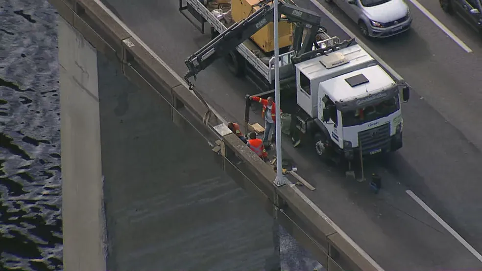 Técnicos consertavam guarda-corpo da Ponte Rio-Niterói por volta das 7h — Foto: Reprodução