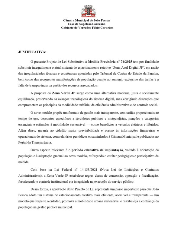 Na justificativa de apresentação do projeto de lei, o vereador apontou que “o presente Projeto de Lei Substitutivo à Medida Provisória nº 74/2025 tem por finalidade substituir integralmente o atual sistema de estacionamento rotativo “Zona Azul Digital JP”, em razão das irregularidades técnicas e econômicas apontadas pelo Tribunal de Contas do Estado da Paraíba, bem como das recorrentes manifestações da população quanto ao aumento excessivo das tarifas e à falta de transparência na gestão dos recursos arrecadados.”