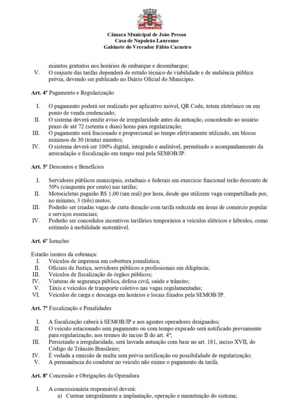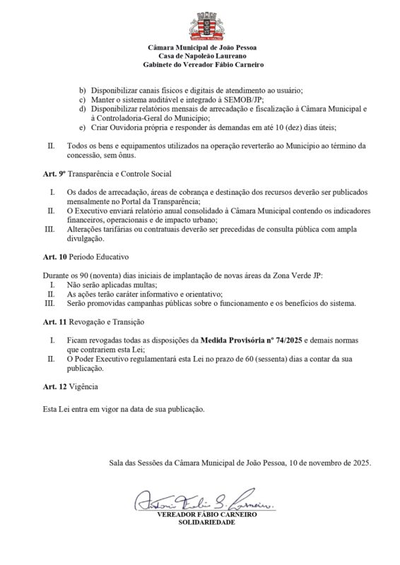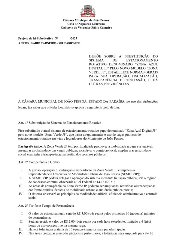 Ainda segundo o vereador, “a proposta da Zona Verde JP surge como uma alternativa moderna, justa e socialmente equilibrada, preservando os avanços tecnológicos do sistema digital, mas corrigindo distorções que comprometem os princípios da modicidade tarifária, da eficiência administrativa e do controle social.”