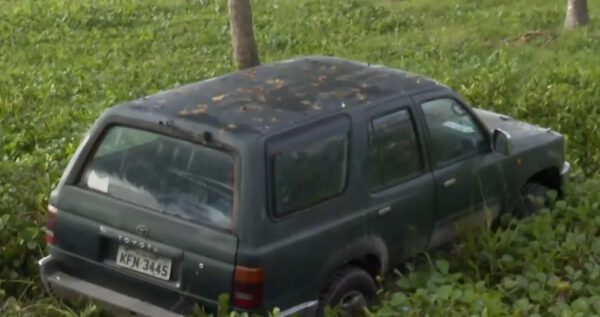 Ele trafegou sobre a vegetação local que está encharcada devido às chuvas dos últimos dias e acabou ficando atolado. Trata-se de um carro antigo e dentro há alguns tonéis, uma caixa de ferramenta.