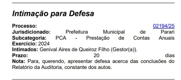 A Prefeitura Municipal da cidade de Parari tem 20 dias para explicar ao Tribunal de Contas do Estado da Paraíba (TCE-PB) algumas irregularidades detectadas na prestação de contas referente ao ano de 2024.