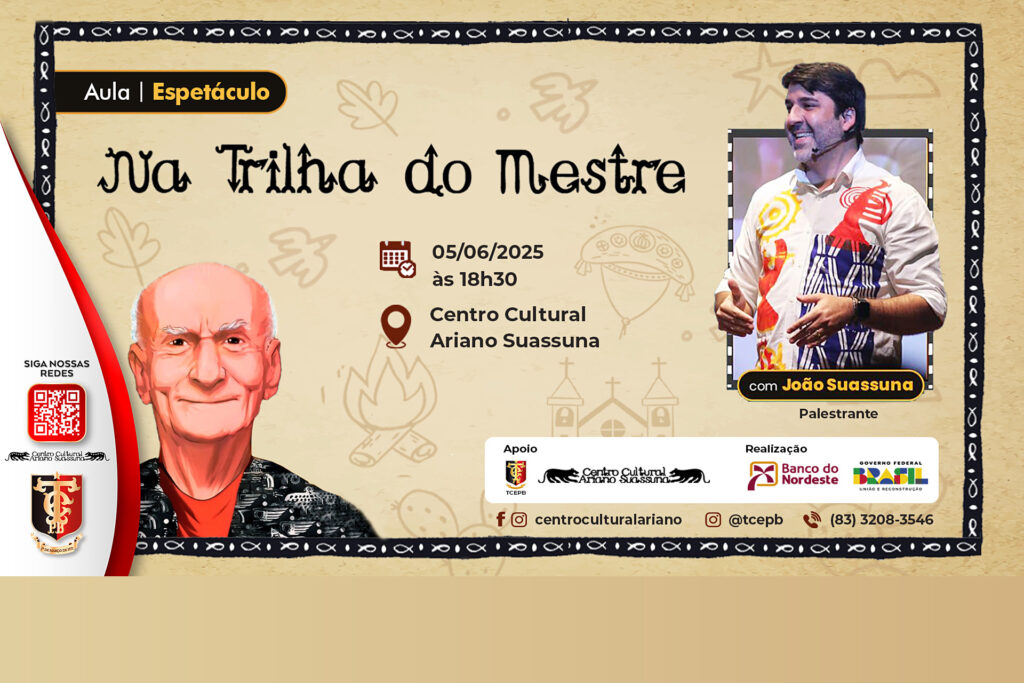 O Tribunal de Contas do Estado recebe a aula-espetáculo do projeto “Na Trilha do Mestre”, realização do Banco do Nordeste do Brasil, produzido por João Suassuna (neto de Ariano) para celebrar a herança cultural nordestina e brasileira. A aula-espetáculo acontecerá nesta quinta-feira (5), às 18h30, no Centro Cultural Ariano Suassuna (CCAS), na sede do TCE-PB em João Pessoa, no bairro de Jaguaribe.
