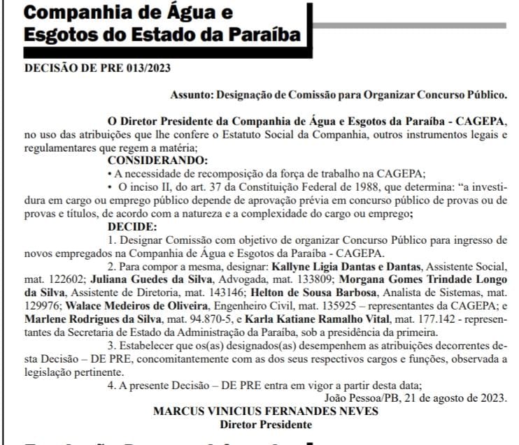Concurso da Cagepa: companhia designa comissão para organizar certame