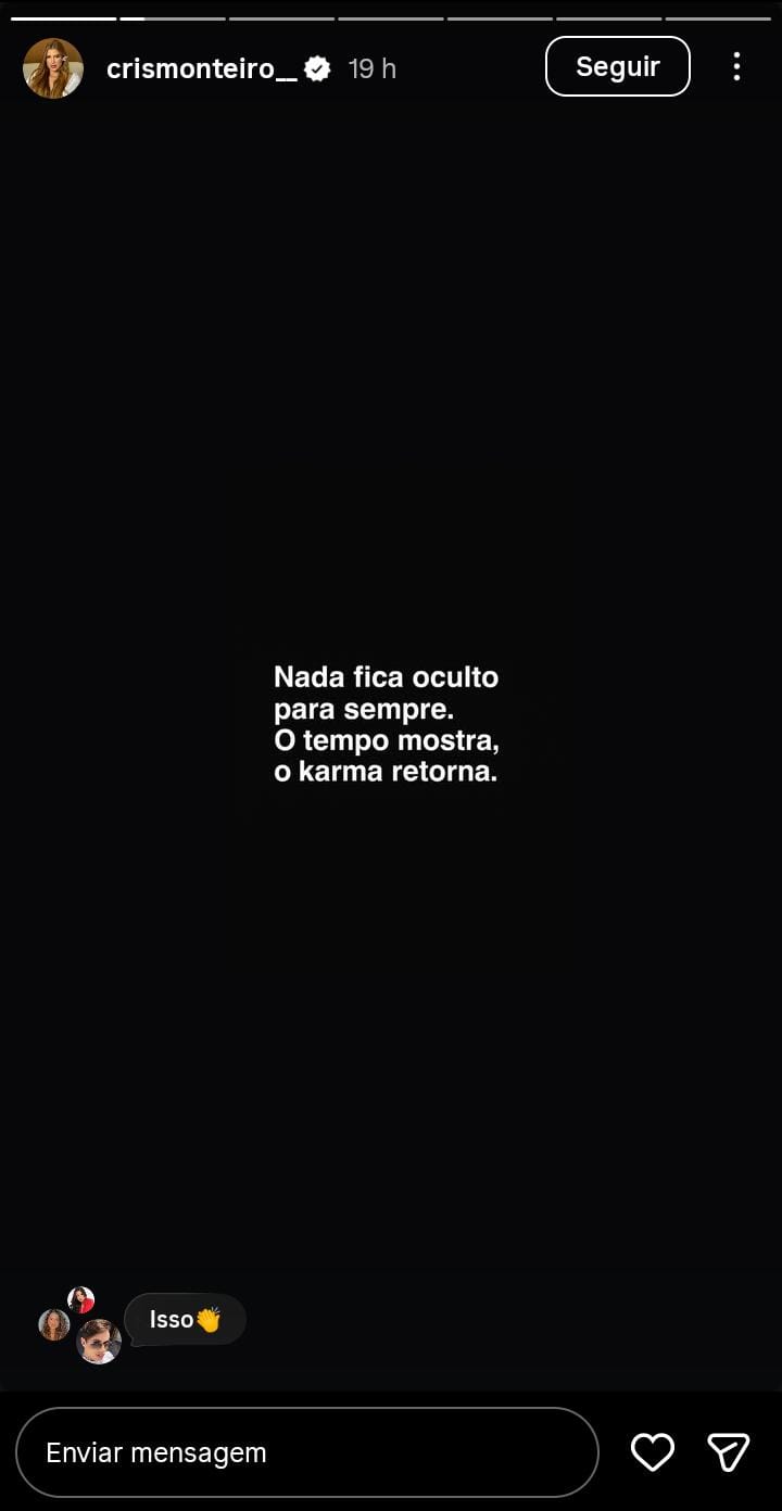 Ex do influenciador, Cris Monteiro usou sua rede social para reagir indiretamente sobre o caso, ao publicar um story com um post escrito: “Nada fica oculto para sempre. O tempo mostra, o karma retorna”. Veja: