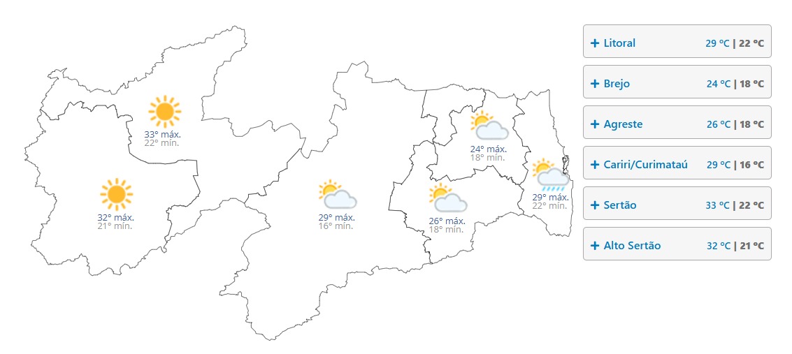 Já o Sertão (mínima de 22º e máxima de 33º) e Alto Sertão (mínima de 21º e máxima de 32º) terão céu claro.