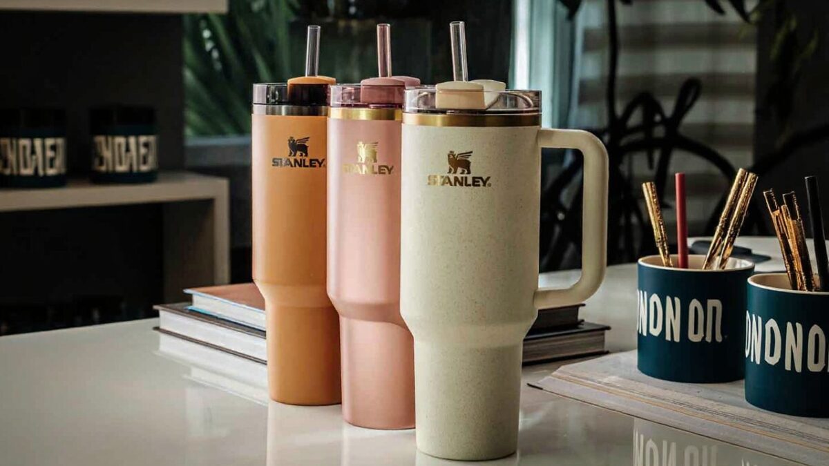 Vários modelos de copos térmicos Stanley coloridos, incluindo o Quencher e o copo de cerveja, em destaque na promoção da Amazon.