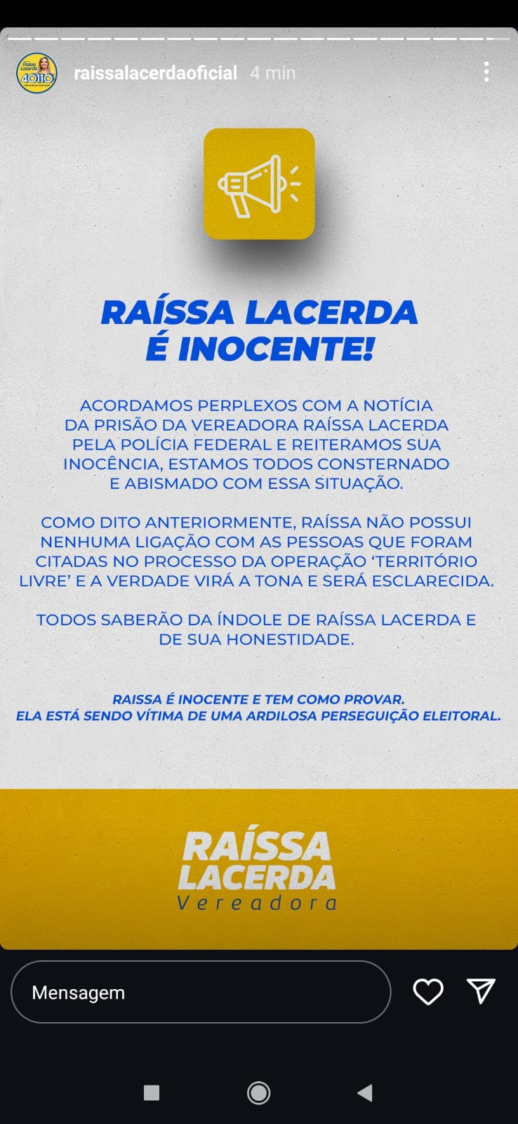 “Acordamos perplexos com a notícia da prisão da vereadora Raissa Lacerda pela Polícia Federal e reiteramos sua inocência, estamos todos consternado e abismado com essa situação. Como dito anteriormente, Raissa não possui nenhuma ligação com as pessoas que foram citadas no processo da operação ‘território livre” e a verdade virá a tona e será esclarecida. Todos saberão da índole de Raissa Lacerda e de sua honestidade. Raissa é inocente e tem como provar. Ela está sendo vítima de uma ardilosa perseguição eleitoral”, diz a nota obtida pelo ClickPB.