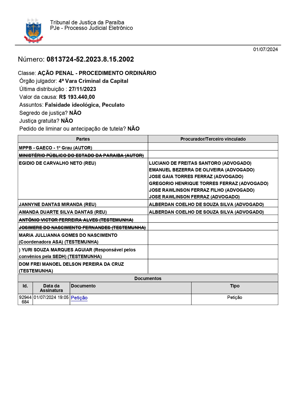 Como apurado pelo ClickPB, enviaram ao juiz José Guedes Cavalcanti Neto, da 4ª Vara Criminal, informações sobre a suposta saída de Egídio de Carvalho. Como publicado pelo ClickPB, o padre teria se ausentado sem autorização da casa onde está para passear na Orla de João Pessoa.