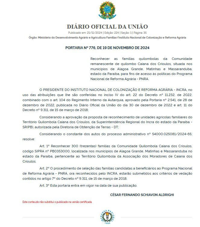Segundo consta na portaria nº 776, ficam “reconhecidas as famílias quilombolas da Comunidade remanescente de quilombo Caiana dos Crioulos, situada nos municípios de Alagoa Grande, Matinhas e Massaranduba, estado da Paraíba, para fins de acesso às políticas do Programa Nacional de Reforma Agrária – PNRA”.