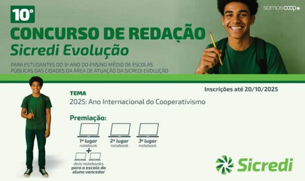 Estão abertas as inscrições para a 10ª edição do Concurso de Redação da Sicredi Evolução para estudantes da rede pública de ensino. Com o tema “2025: Ano Internacional do Cooperativismo”, os textos devem abordar o sentido transformador das cooperativas na sociedade e sua contribuição para o desenvolvimento econômico e social, inclusão financeira e fortalecimento das comunidades.