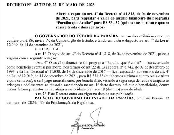 O reajuste está publicado no Diário Oficial do Estado desta terça-feira (23). A lei que garante o pagamento foi criada e sancionada em 2021 pelo governador João Azevêdo. O Programa Paraíba que Acolhe é voltado para ações de proteção social e concessão de auxílio financeiro agora de R$ 534,32 mensais para crianças e adolescentes de famílias de baixa renda que ficaram órfãos devido à morte dos pais ou responsáveis legais em decorrência da Covid-19.
