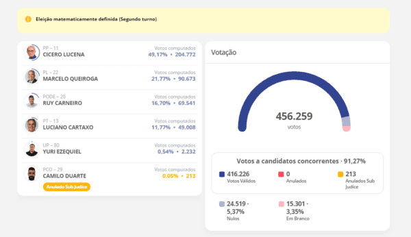 Ruy Carneiro (PODEMOS), Luciano Cartaxo (PT), Yuri Ezequiel (UP) e Camilo Duarte (PCO) não conseguiram votos suficientes para alcançar o segundo turno.
