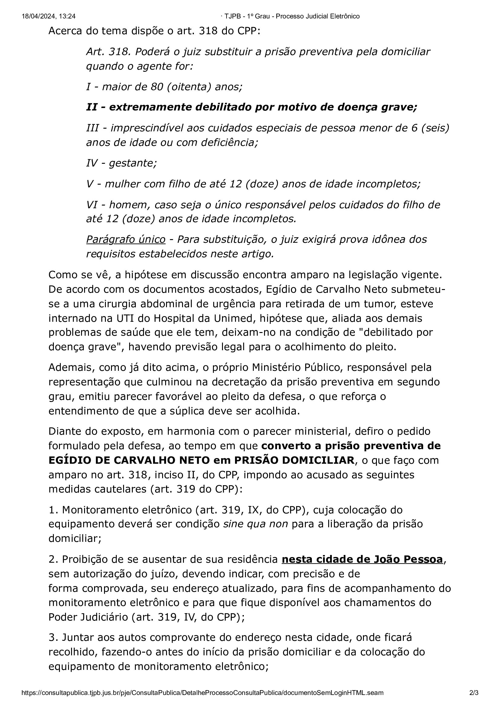 Na decisão verificada pelo ClickPB, o juiz afirmou que que o próprio Ministério Público se manifestou favorável a prisão domiciliar. Além disso, o juiz determinou que padre Egídio use tornozeleira eletrônica.