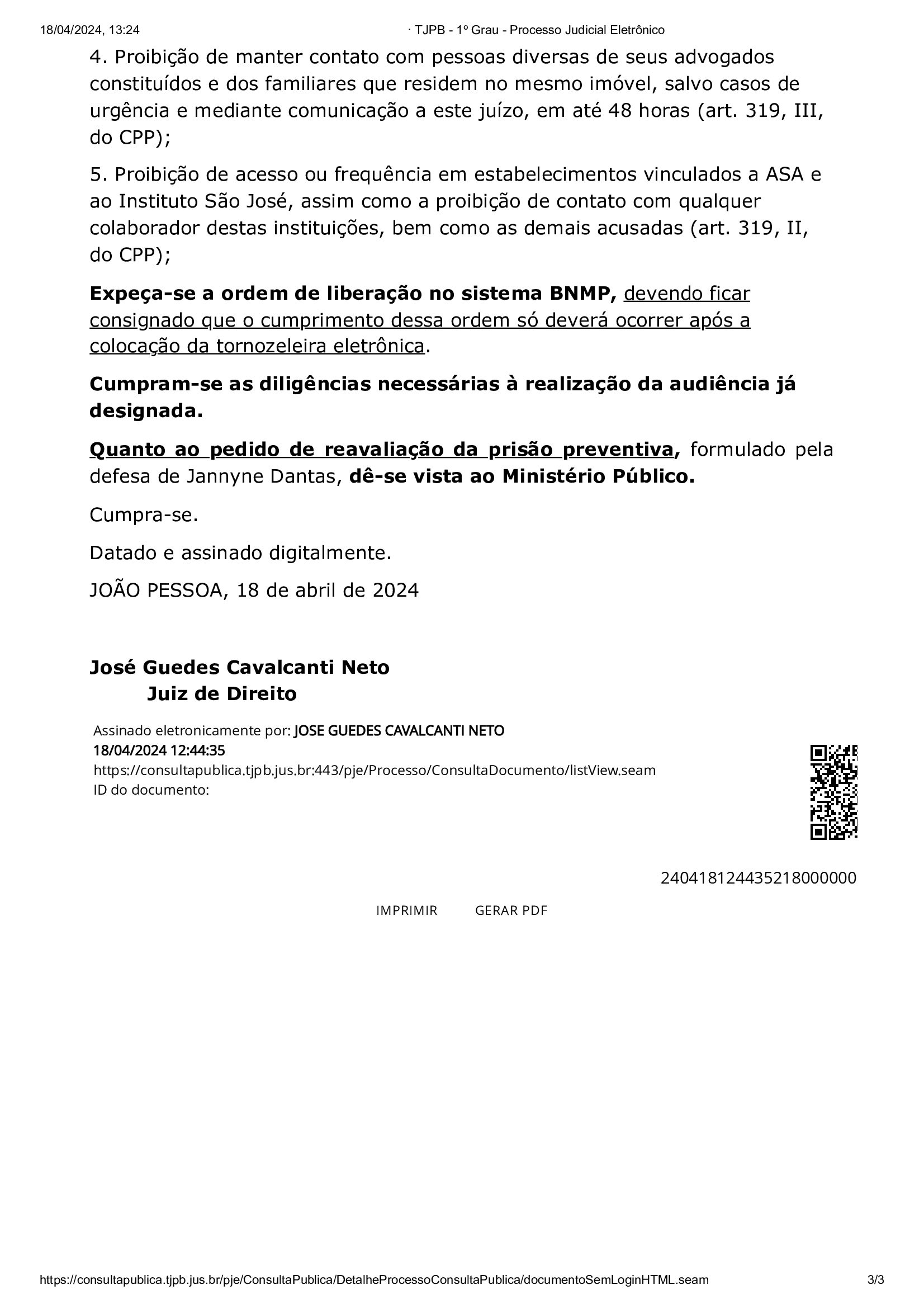 - Proibição de se ausentar de sua residência em João Pessoa sem autorização prévia;
