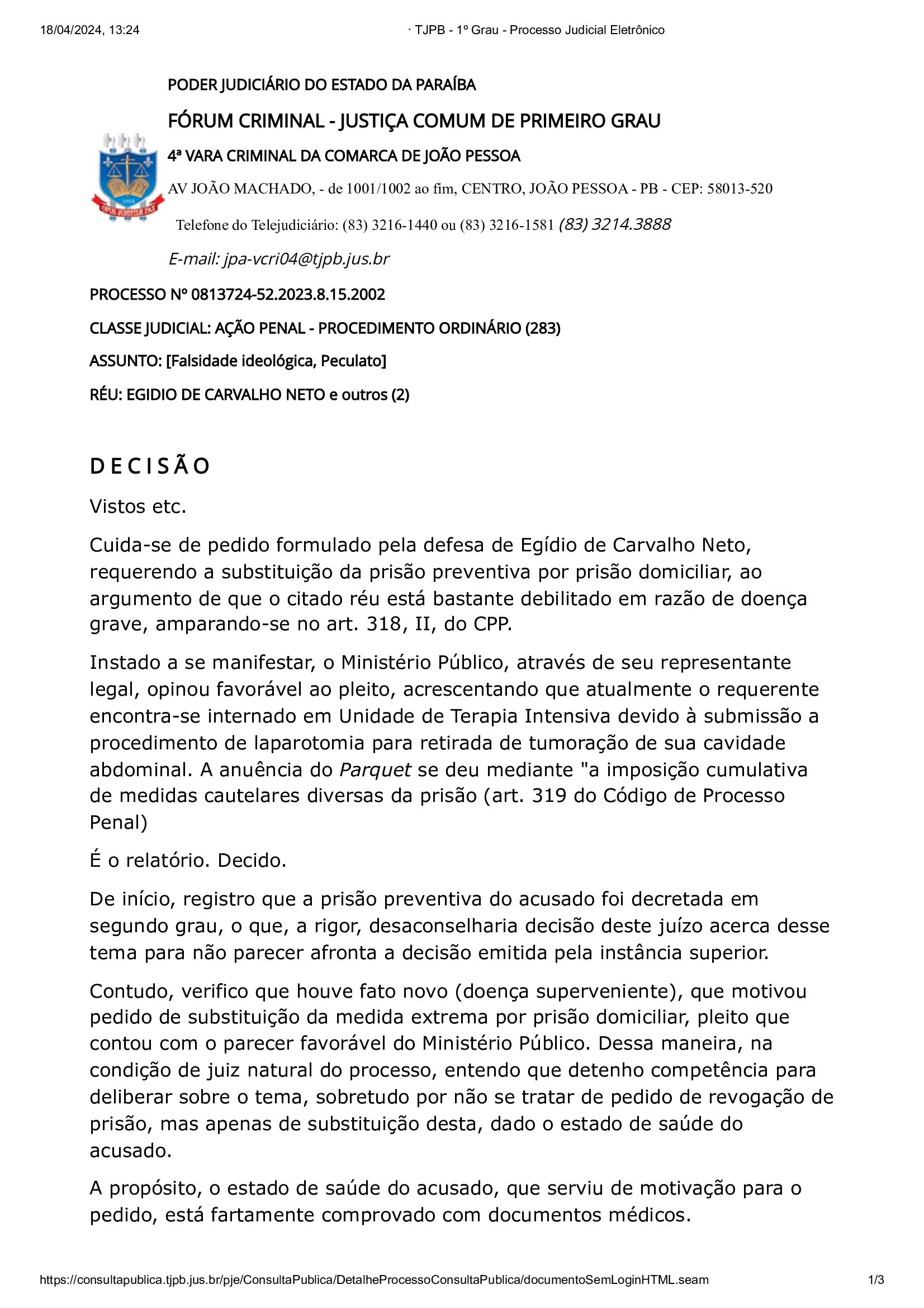 - EXCLUSIVO: confira, na íntegra, decisão que mantém Egídio preso acusado de desvios no Hospital Padre Zé