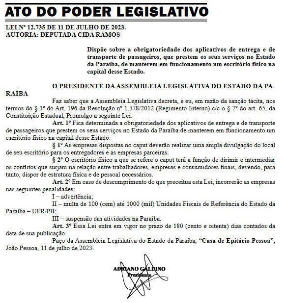 As empresas que atuam com aplicativos de entrega e de transporte de passageiros na Paraíba devem no prazo de 180 dias, a partir de hoje (12), instalar ao menos um escritório físico em João Pessoa. O ClickPB apurou que a lei que garante tal obrigatoriedade foi publicada na edição desta quarta-feira (12) do Diário Oficial do estado. Ela é de autoria da deputada Cida Ramos (PT) e foi promulgada pelo presidente da assembleia, Adriano Galdino (Republicanos).