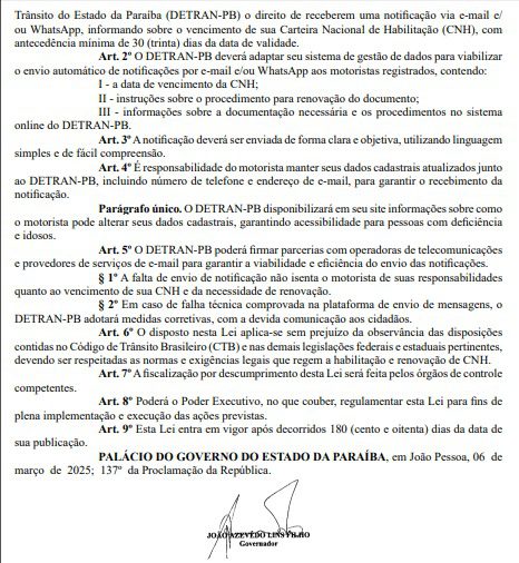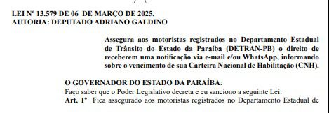 O governador João Azevêdo sancionou lei que determina aviso de vencimento da CNH por e-mail e Whatsapp aos motoristas cadastrados no Departamento Estadual de Trânsito do Estado da Paraíba (Detran-PB). A Lei nº 13.579 de autoria do deputado Adriano Galdino, publicada no Diário Oficial do Estado (DOE) desta sexta-feira (7), entrará em vigor em 180 dias.