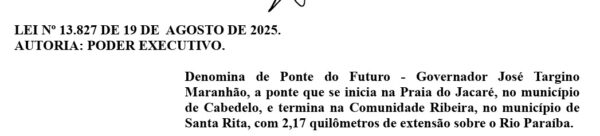 O governador da Paraíba, João Azevedo, sancionou a lei que dá o nome do Governador José Targino Maranhão à Ponte do Futuro. A Lei nº 13.827 de 19 de agosto de 2025 foi publicada na edição de hoje do Diário Oficial do Estado da Paraíba.