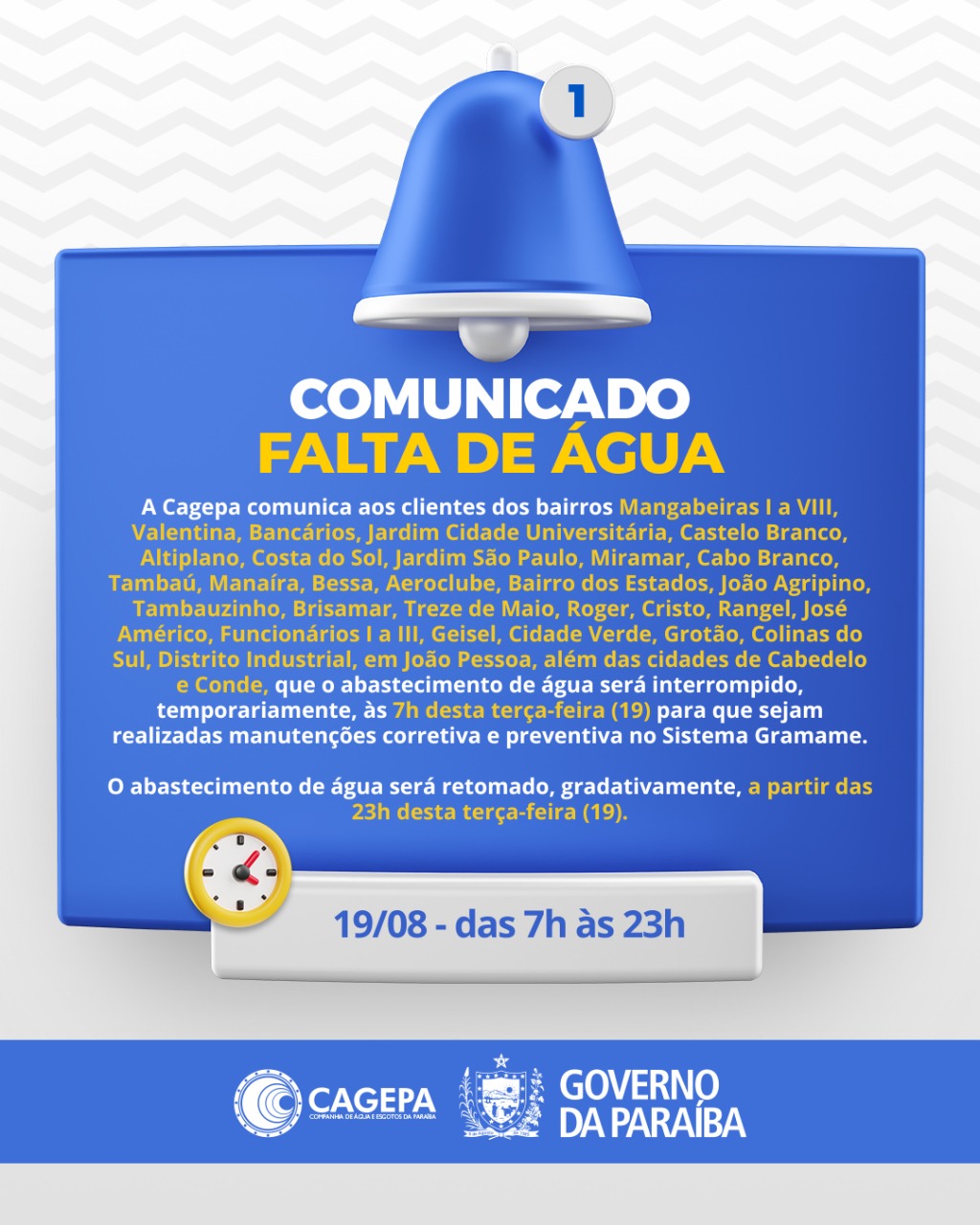Confira a seguir o alerta emitido pela Cagepa: