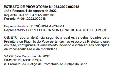 O Ministério Público abriu investigação para apurar a denúncia na qual os veículos alugados pela Prefeitura de Riachão do Poço, no interior da Paraíba, pertencem ao esposo da atual prefeita do município.