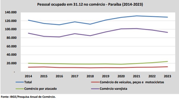 Em dez anos, a Paraíba teve um aumento de 5,9% na quantidade total de pessoas ocupadas no comércio, que partiu de 121.378, em 2014, e subiu para 128.573 pessoas ocupadas, em 2023. Em relação a 2022, quando esse total era de 130.044 pessoas ocupadas, houve recuo no indicador, de 1,1%.