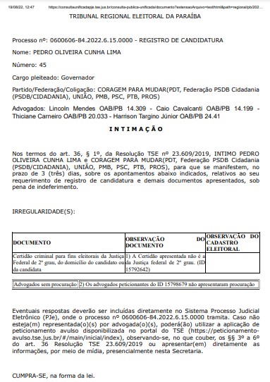 Pedro Cunha Lima não apresenta certidão ‘nada consta’ e TRE dá prazo de três dias para entrega de documento