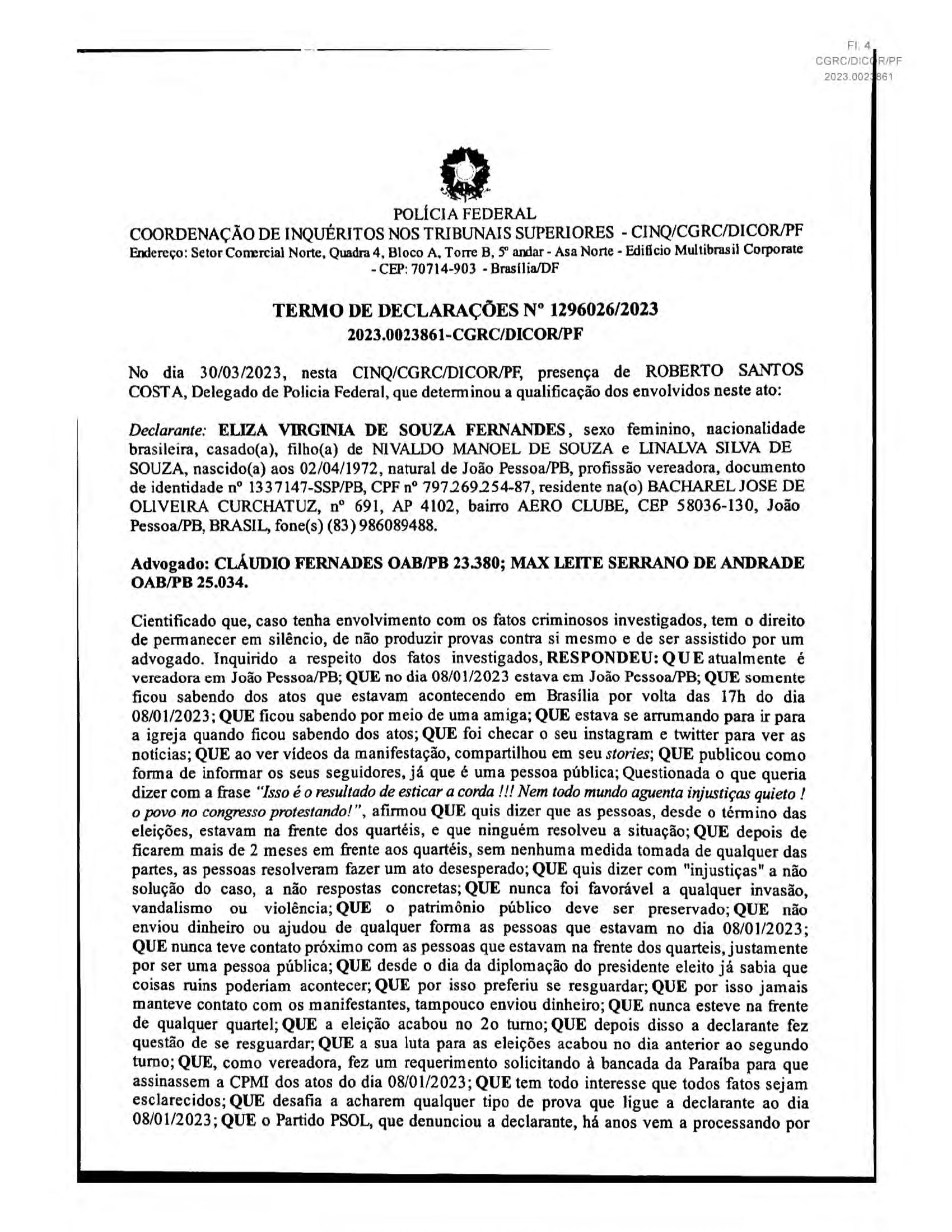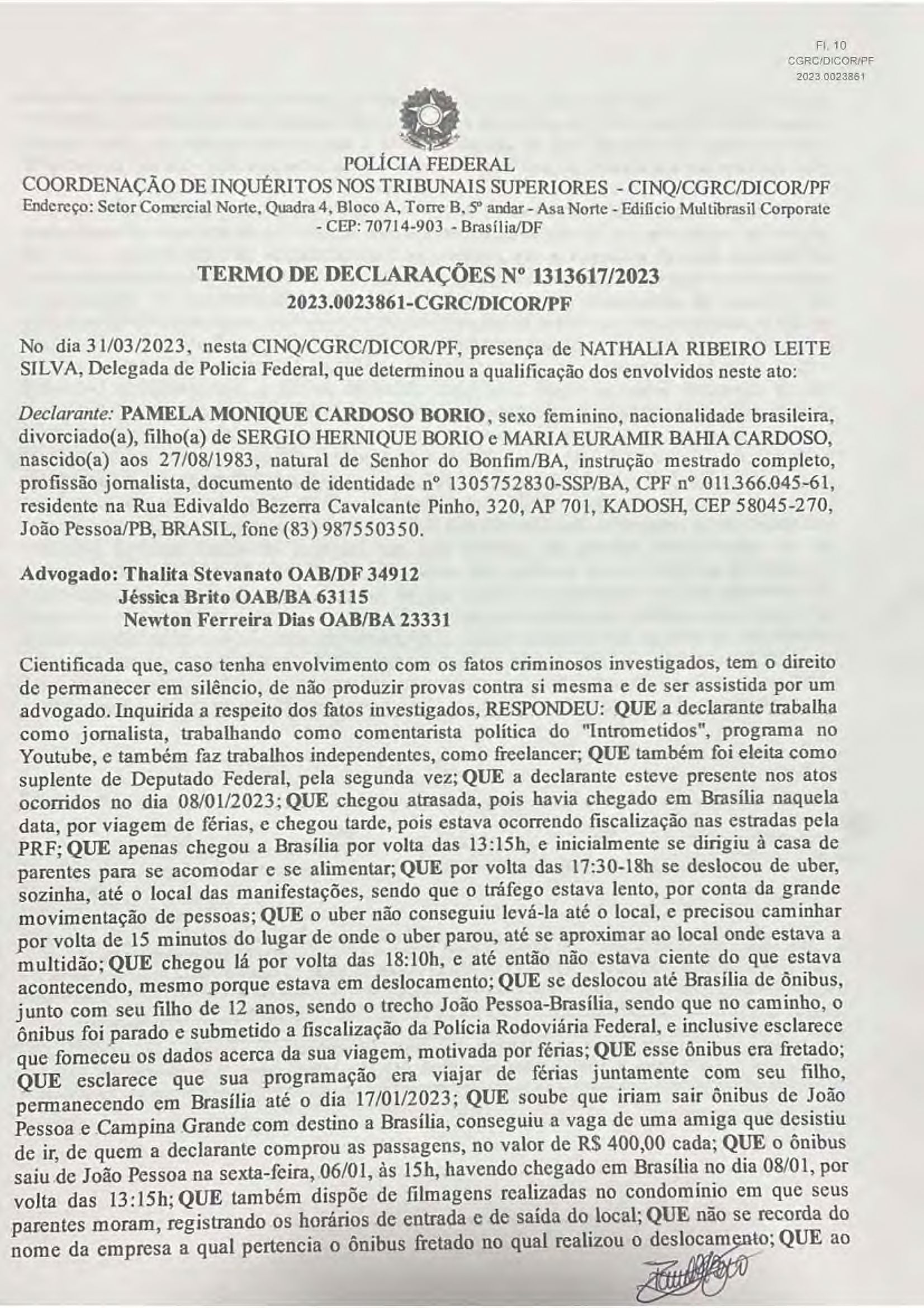 Polícia Federal envia ao STF relatório de oitivas de Nilvan Ferreira, Walber Virgolino, Cabo Gilberto, Eliza Virgínia e Pâmela Bório sobre 8 de janeiro
