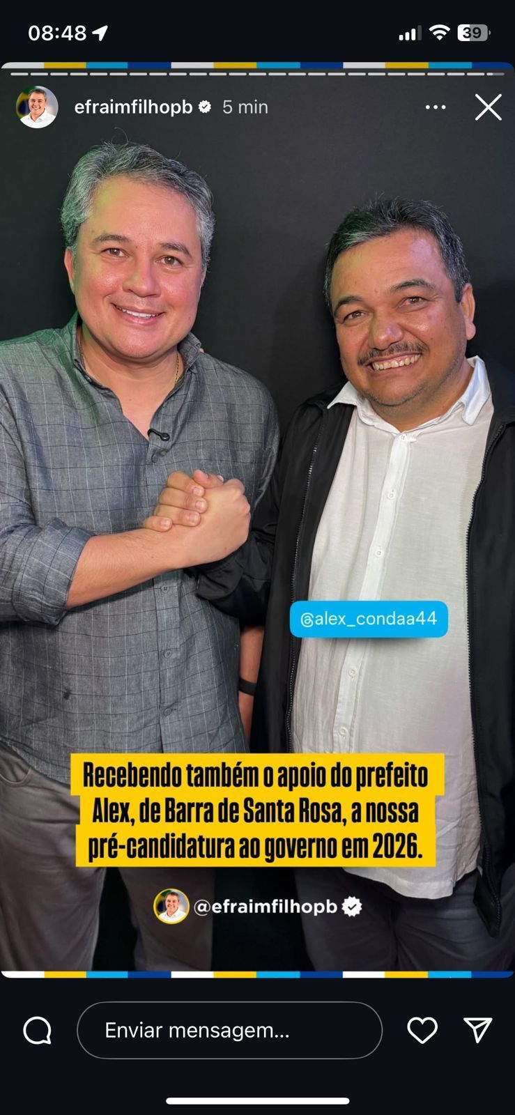 As novas declarações do prefeito de Barra de Santa Rosa surgiram após publicação feita pelo senador Efraim Filho em suas redes sociais. Efraim publicou foto com Alex Condá com a seguinte legenda: “recebendo também o apoio do prefeito Alex, de Barra de Santa Rosa, a nossa pré-candidatura ao governo em 2026”.