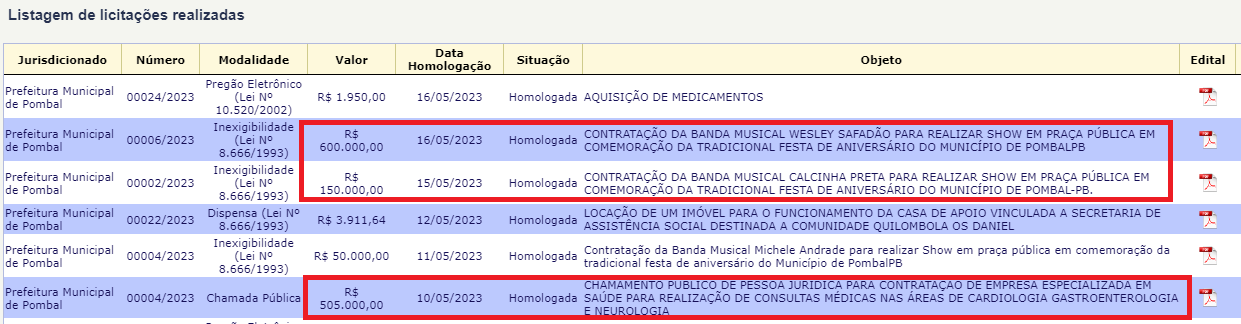 No total, serão R$ 920 mil em contratações de shows para a festa de emancipação de Pombal, em julho deste ano.