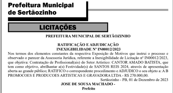 Prefeitura de Sertãozinho contrata quase meio milhão de reais em shows para Festa de Reis