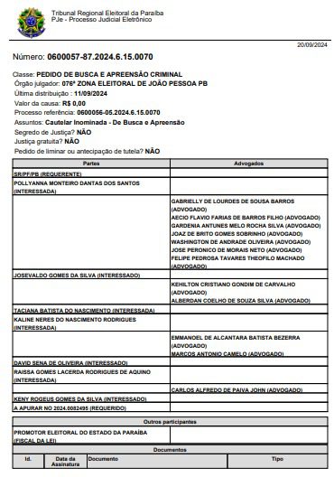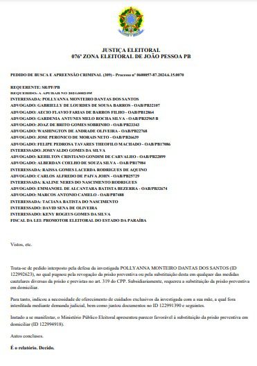 Pollyanna, de acordo com a investigação da PF, atuaria junto com as outras pessoas investigadas determinando a preferência por candidatos em alguns bairros e comunidades de João Pessoa.