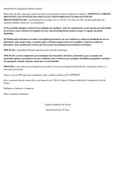 Ao aceitar o pedido e decidir pela prisão preventiva domiciliar, a juíza definiu as seguintes medidas: