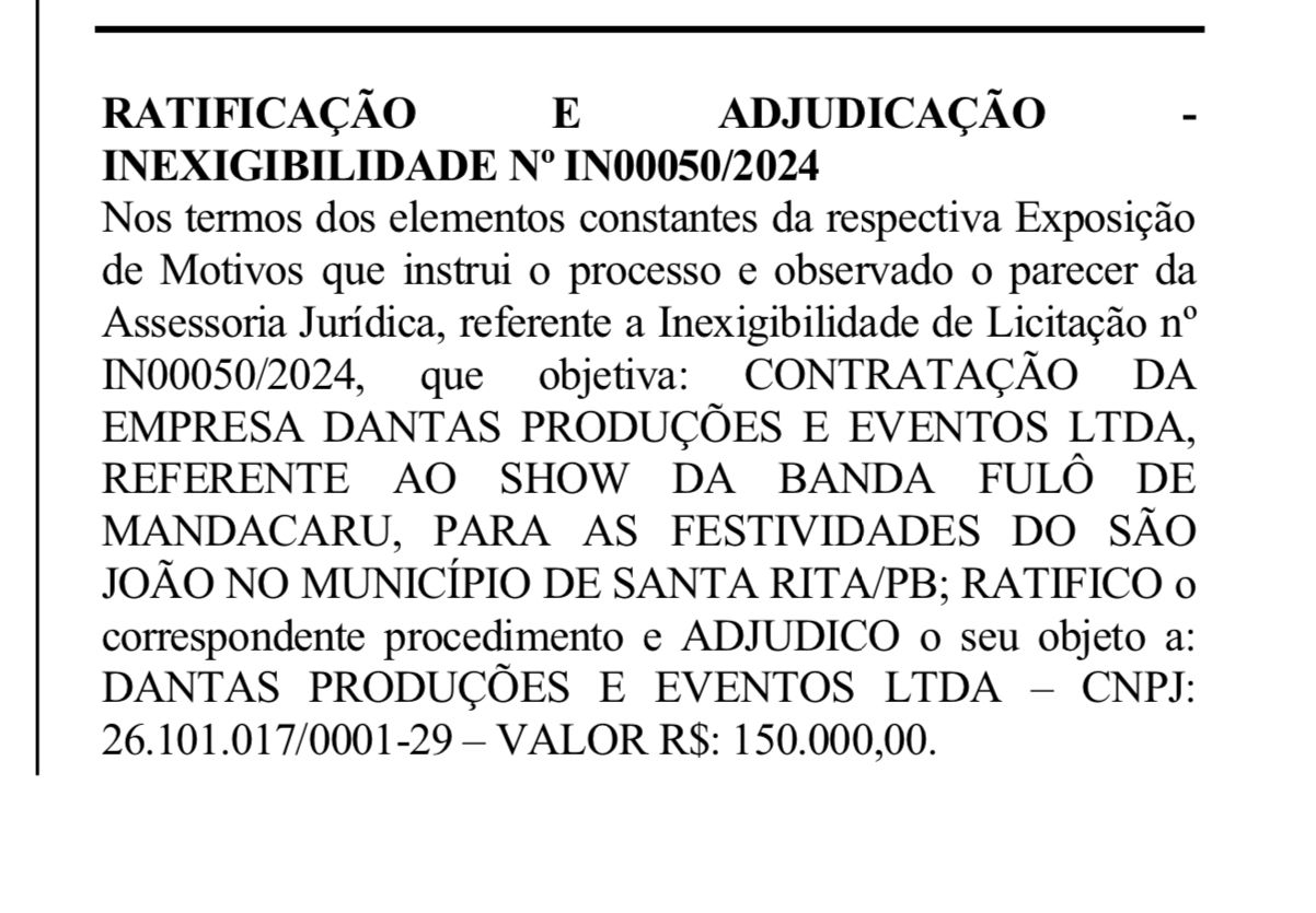 O município vai desembolsar ainda R$ 150 mil para show da banda Fulô de Mandacaru no mesmo evento.