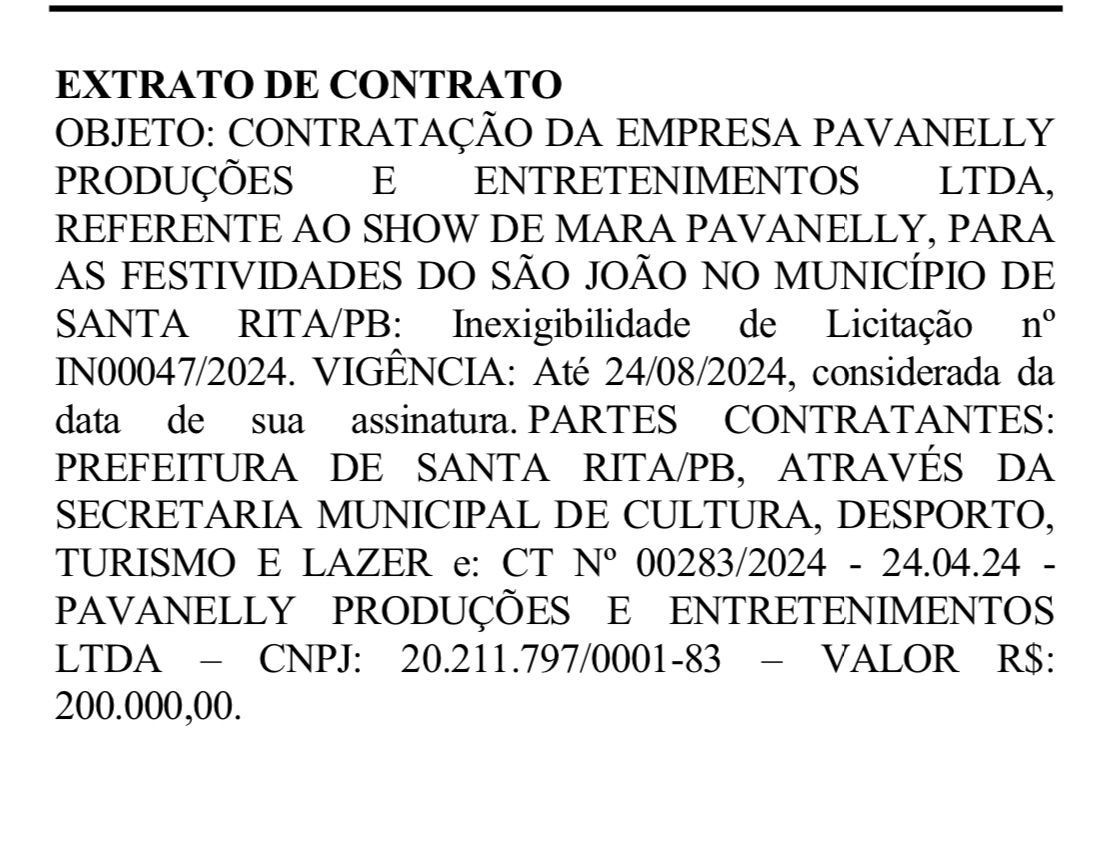 A cantora Mara Pavanelly, por exemplo, vai receber R$ 200 mil por sua apresentação nas festividades do São João, no município. A contratação acontece sem licitação, firmada entre a Secretaria de Cultura, Desporto, Turismo e Lazer da cidade e a Pavanelly Produções e Entretenimentos Ltda.