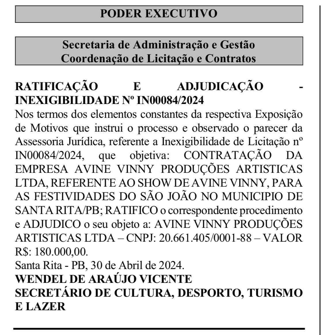 Também será contratado para se apresentar no São João de Santa Rita o cantor Avine Vinny, cujo cachê, a ser pago pela Prefeitura da cidade, é de R$ 180 mil.