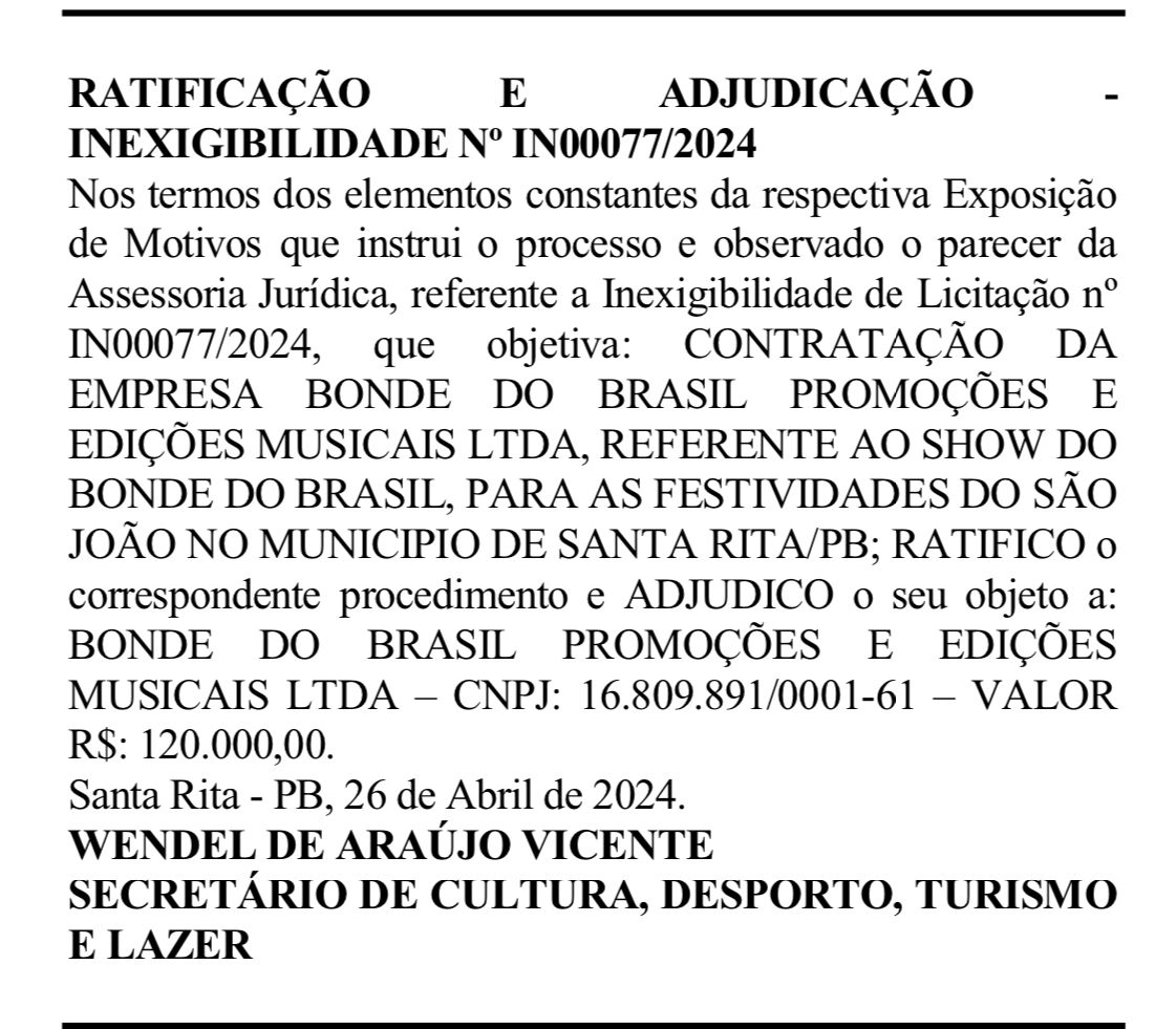 A Prefeitura de Santa Rita vai ‘torrar’ R$ 1.150.000,00 milhão em cinco shows que serão realizados durante os festejos juninos da cidade. O maior cachê é do cantor Bell Marques, que vai embolsar R$ 500 mil, mas outras atrações também têm contratos com valores ‘salgados’.