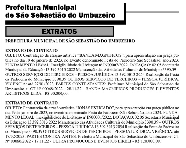 A Prefeitura de São Sebastião de Umbuzeiro gastou R$ 210 mil nas contratações da banda Magníficos e do cantor Jonas Esticado. Eles vão se apresentar na Festa do Padroeiro de São Sebastião, no dia 19 de janeiro de 2023.