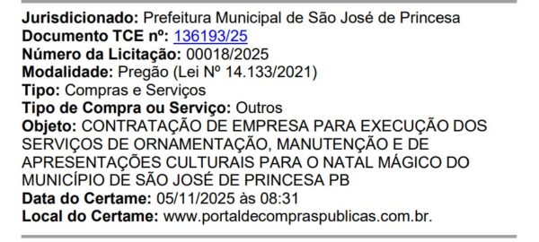 Com menos de 5 mil habitantes, a prefeitura da cidade de São José de Princesa vai gastar R$ 294 mil com decoração e programação de Natal. Os dados gerados irão para o Portal de Contas Públicas.