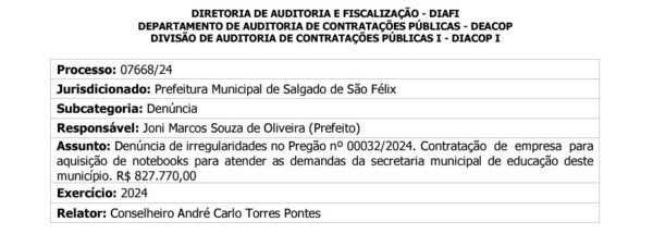 O Tribunal de Contas do Estado da Paraíba (TCE-PB) detecta irregularidades em contrato de R$ 827.770 da Prefeitura de Salgado de São Félix para aquisição de notebooks. O contrato é oriundo do Pregão nº 00032/2024 e foi homologado em 12 de dezembro de 2024, vencido por CH3 Contratos e Negócios LTDA.