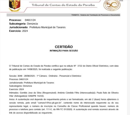 O Tribunal de Contas do Estado da Paraíba (TCE-PB) intimou o prefeito de Tavares, Genildo José da Silva, para explicar algumas irregularidades detectadas pela auditoria do órgão, em processo licitatório para construção de açude pelo valor de mais de R$ 350 mil. Ele deve comparecer ao pleno do dia 28 de agosto.