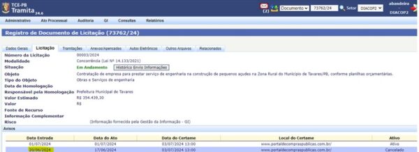 O processo trata de denúncia com pedido de cautelar formalizada pelo ex-vereador, Antônio Cândido Filho, em desfavor da Prefeitura devido à supostas irregularidades na realização da Concorrência Eletrônica nº 0003/2024.