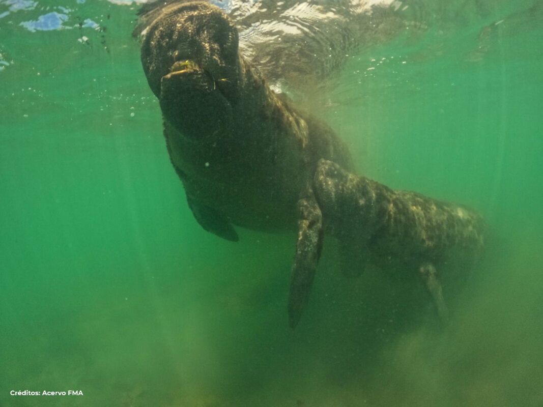 Peixe-boi 'favo' em amamentação. (foto: Sebastião Silva/Fundação Mamíferos Aquáticos/divulgação)