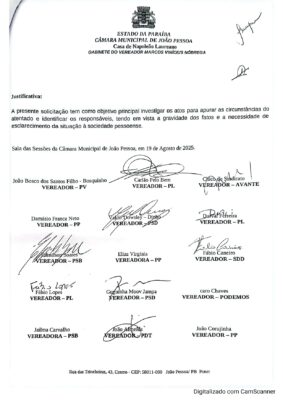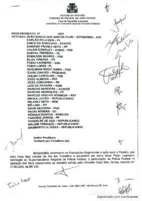 Vereadores de João Pessoa assinaram um requerimento em que solicitam a entrada da Polícia Federal na investigação do atentado contra o vereador Guga Moov Jampa. Conforme documento obtido com exclusividade pelo jornalista Clilson Júnior, nesta terça-feira (19), o requerimento tem assinatura de todos os parlamentares. O requerimento é de iniciativa do vereador Marcus Vinicius.