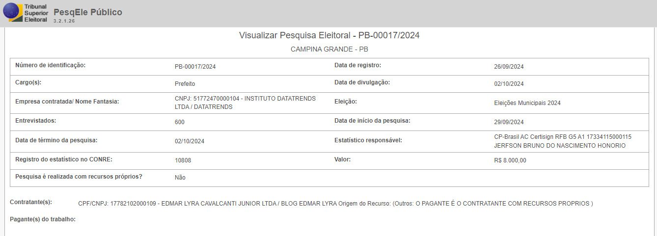 A pesquisa Datatrends vai ouvir ao todo 600 eleitores. Ela foi encontrada pelo Blog do Edmar Lyra e custou R$ 8 mil. O estatístico responsável é Jerfson Bruno do Nascimento Honório.