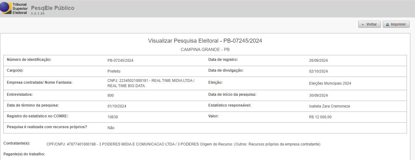 A semana da eleição 2024 deverá ter a divulgação de ao menos três pesquisas de intenção de voto no município de Campina Grande, no Agreste do estado. A informação foi obtida pelo Portal ClickPB por meio de dados disponíveis no sistema PesqEle, do Tribunal Superior Eleitoral (TSE). O ClickPB observou* que ao menos três pesquisas devem ser divulgadas até a sexta-feira (04), antevéspera do pleito de 2024.